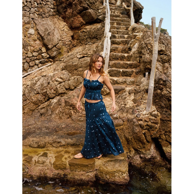 Hand-dyed using shibori techniques, this skirt is truly one of a kind. With an elasticated waist, full tiers and deep navy tie-dye, this skirt pairs perfectly with the matching top. High waisted cut A-line skirt that skims the body Size tip: we recommend y