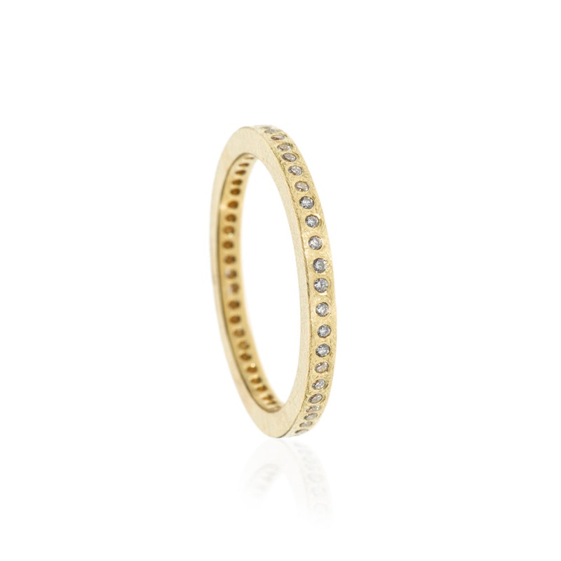 A perfect example of the artisanal luxury that Todd Reed is known for. Brilliant diamonds dance around a surface of 18K yellow gold enlivened by subtle hand-hewn cross-hatching. 0.18ctw