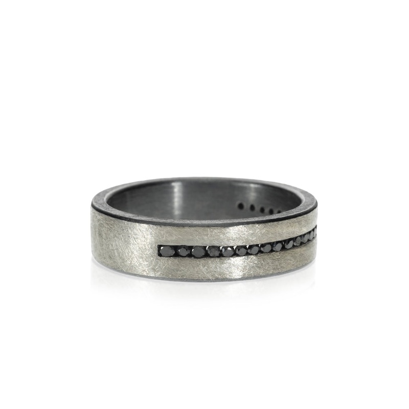 A beautiful men’s band from designer Todd Reed. The ring features a subtle row of black diamonds down the center, accentuated by a darkened palladium finish. 0.38cttw