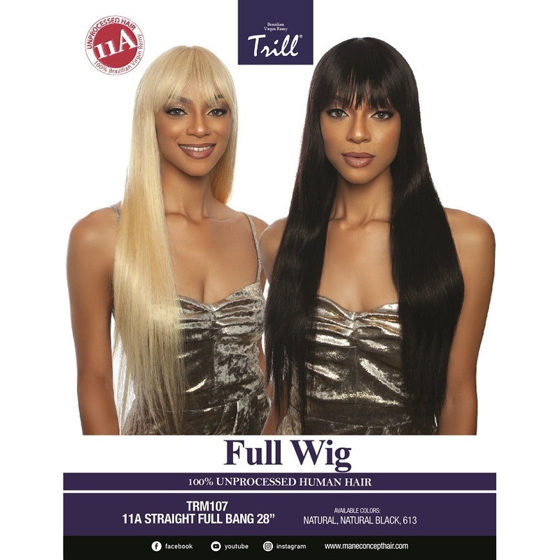 TAKE A BREATH OF FRESH AIR WITH TRILL, OUR LINE MADE WITH 11A BRAZILLIAN 100% UNPROCESSED HUMAN HAIR28" FULL WIGLOOSE BODY FULL BANG CURL STYLELAYERED CURLS LONGEVITY