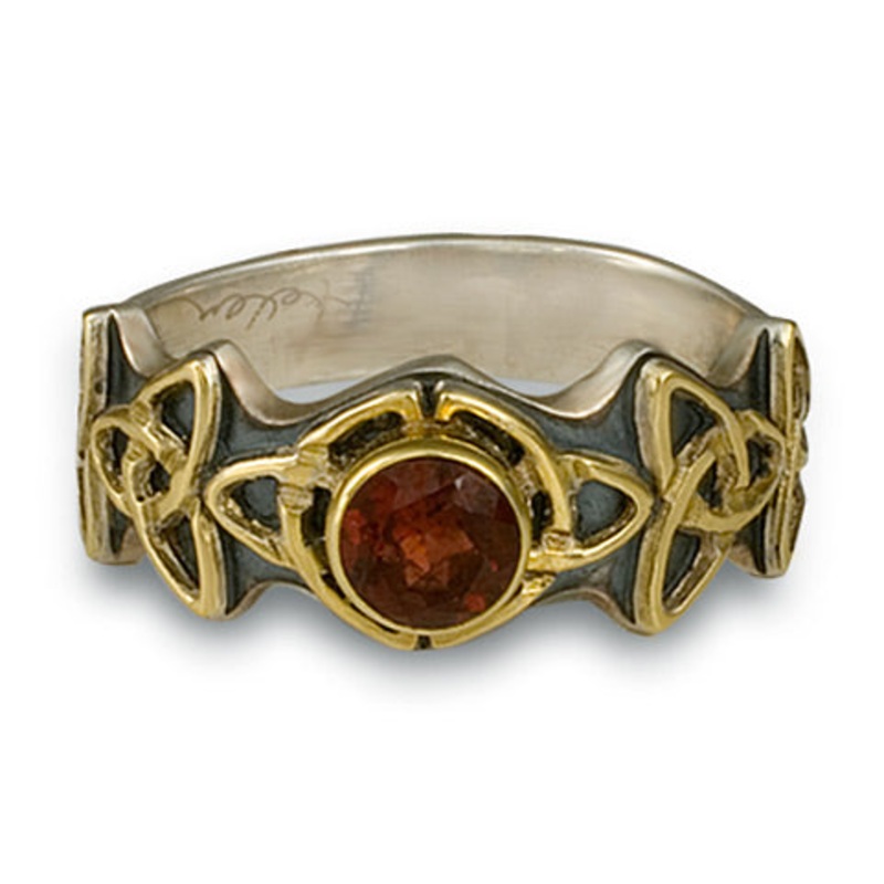 This ring features six Trinity knots, narrowing to the backside of the ring, which is a plane silver band. The knot itself represents the mother, maiden and crone; earth, heavens and the underworld; the past, present and future. This ring matches several other designs in our Aria Collection. The Trinity Ring with Stone is shown with a faceted garnet set in 14K gold.
