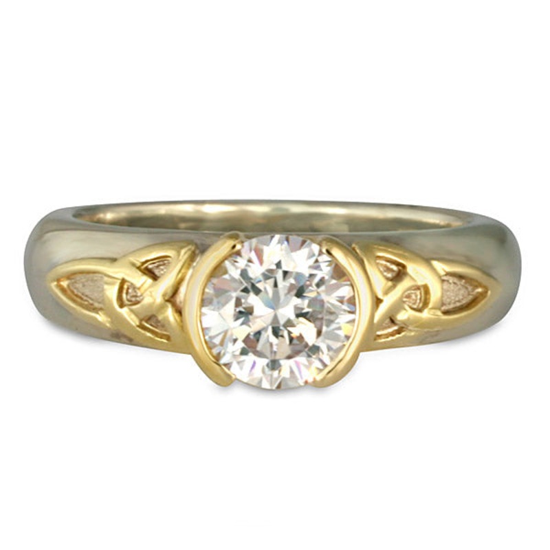 This Beautiful Engagement Ring in Two Tone 14K Gold Features a 1 Caret Diamond as shown, with Celtic Trinity knots framing the Diamond.This ring can also be made with a Sapphire.