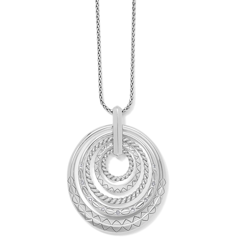 Nested rings etched with hand drawings by designer Tom Clancy create a stunning silver-plated statement necklace.Style: #JM4441Color: SilverClosure: Lobster ClawLength: 18" - 20" AdjustablePendant Drop: 2 1/2"Finish: Silver plated