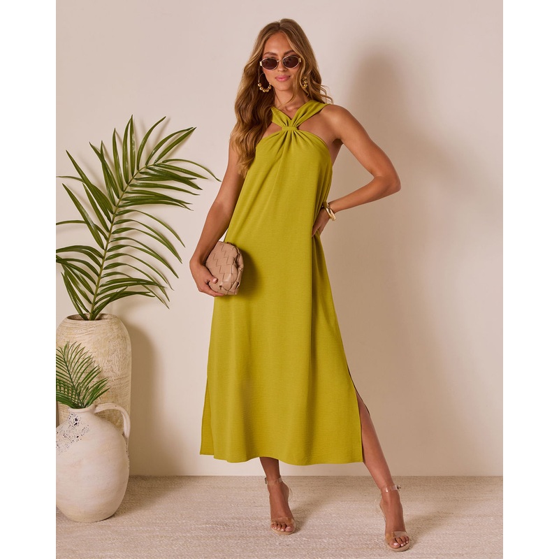 Meet the Tropic Whisper Halter Maxi Dress. With its breezy crinkle crepe fabric and dreamy pleated detailing, this maxi moves like a tropical breeze and feels just as light. The halter neckline features a cinched detail that flatters the bust, while the el