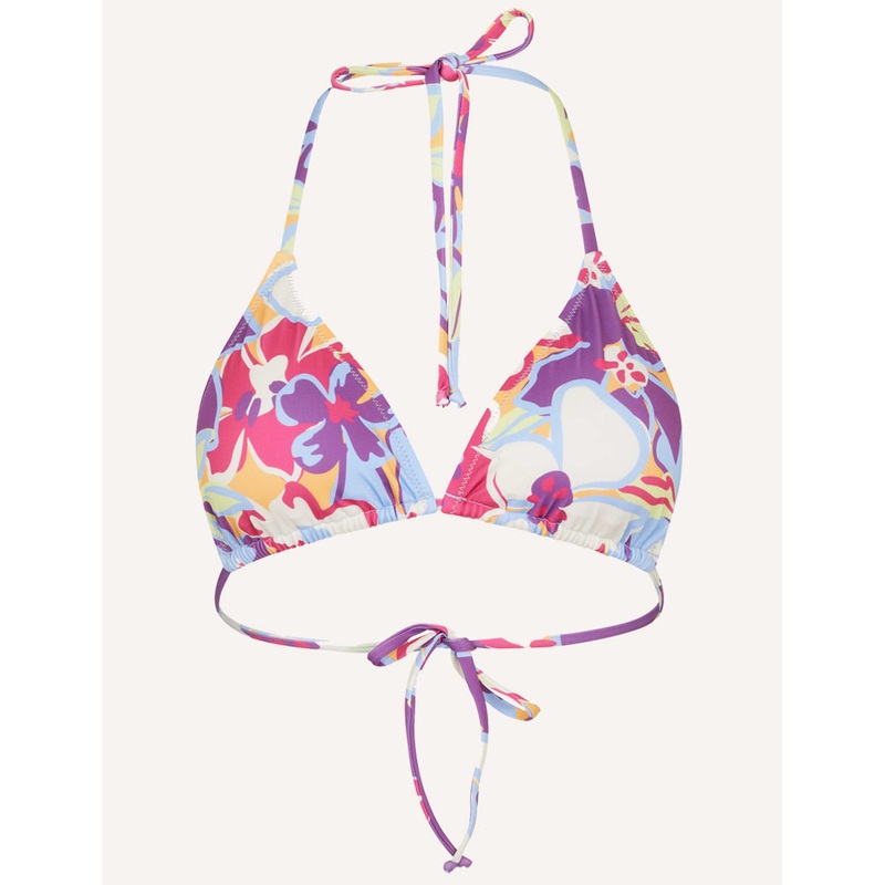 This Georgina bikini top was designed for island hopping in a tropical floral print. Triangle cups and self-tie straps offer support. Team with the matching bottoms and find the nearest beach club. Triangle padded cups Under bust gathers Self-tie straps Li