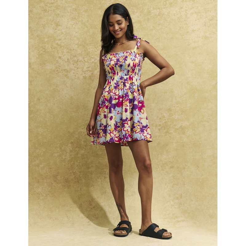 Head to the beach club in this tropical-inspired smock dress. With shirred detailing and a flowing mini skirt, Rashidas perfect for slipping on over your bikini. Two thick straps turn to reveal an open back all of which are finished with soft bows. Style yours with espadrilles and a sun lounger.