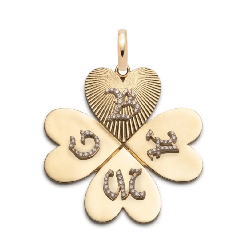 Crafted in 18k Yellow Gold, our Oversized Four Heart Clover represents True Love. Additionally, the clover is a symbol of fire… Transformation, energy, passion, and creativity. Beautiful on its own, this piece is customizable with up to four initials.