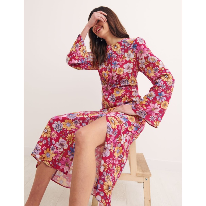 Pay attention to the back of our Tula midi dress. It features cut-out detailing with a D.I.Y tie and a form-fitting frame and florals all over. A subtle leg slit and bell sleeves makes it both comfortable and stylish. Wear with trainers or heels depending on your vibe.