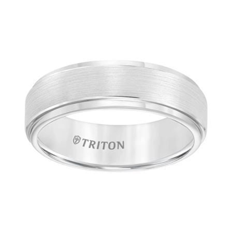 7mm white tungsten carbide brush finish flat with bright round rims comfort fit band.PLEASE NOTE: This can be ordered in different metal types. Our men's stock sizes are between 10 - 11, sizes less or greater can be special ordered (prices may vary). Based