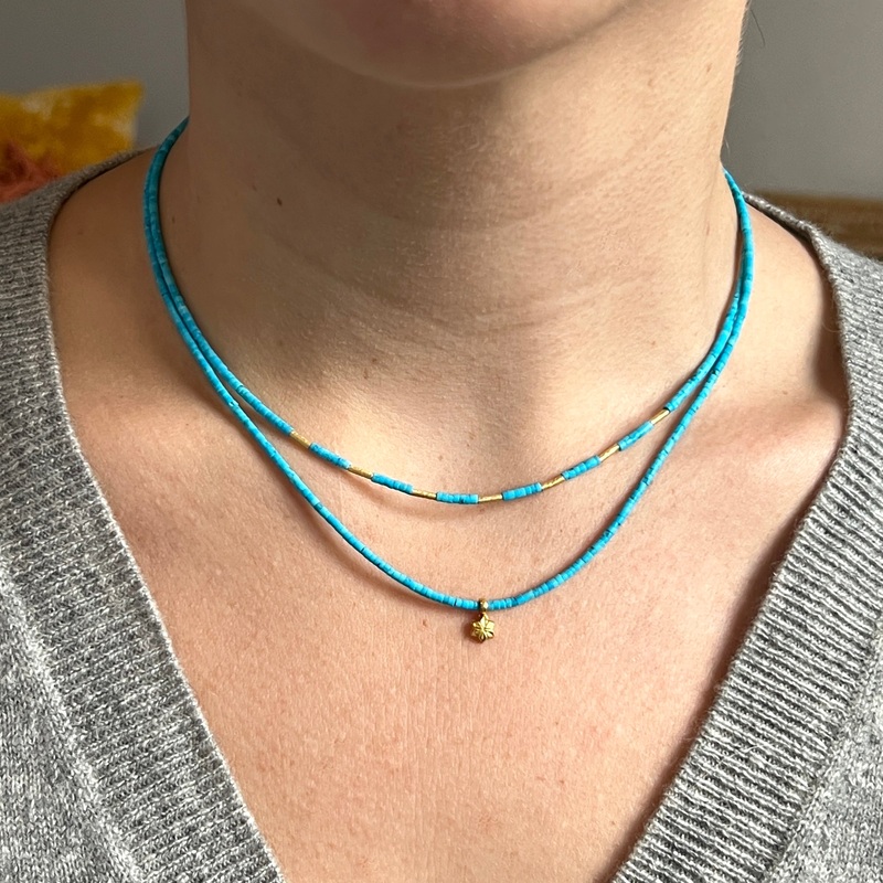 We've combined bright-blue natural turquoise mini tube beads with a 22k golden star charmto make a delicate layering piece that's perfect for adding a pop of colorto your necklacewardrobe.Shown wornwith ourturquoise mini bead featuring hammered 22k gold sp