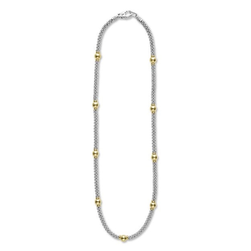 This sterling silver and 18 karat yellow gold LAGOS Signature Caviar station necklace features nine smooth ball stations and a Signature lobster clasp. Length is 18 inches.