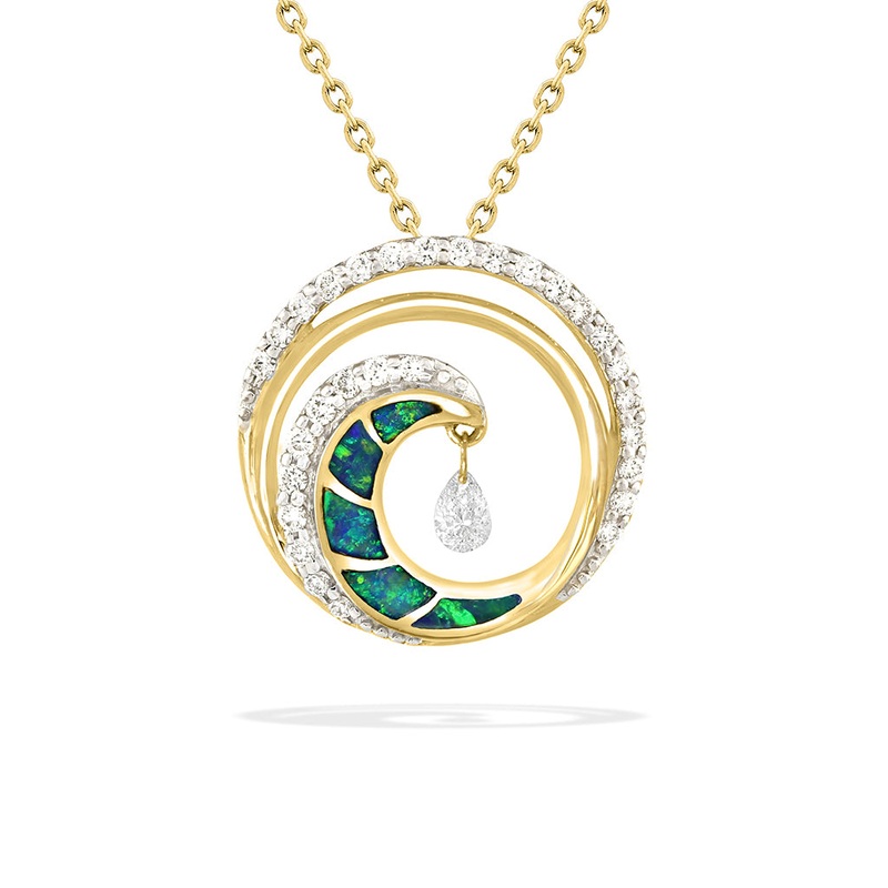 14K Yellow Gold Ultimate Wave Shimmer Pendant with Opal Inlay and 0.33 Carats (total weight) of Diamonds, including a 0.08 Carat Shimmer Diamond. 17″ 14K Yellow Gold Chain included. The pendant measures approximately 11/16″ in diameter.