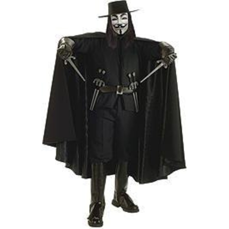 Includes: Shirt, pants, boot tops, hat, cape, belt with 6 daggers & mask.