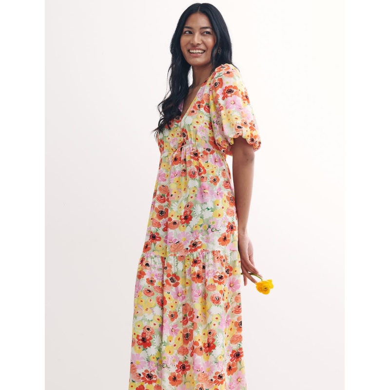 Expect compliments in our Valentine wrap dress. Featuring a relaxed fit with short, slightly puff sleeves, it's balanced by a nipped-in waist and a tiered hemline. Vintage-inspired floral blooms make it a romantic choice for off-duty days. Keep it casual a