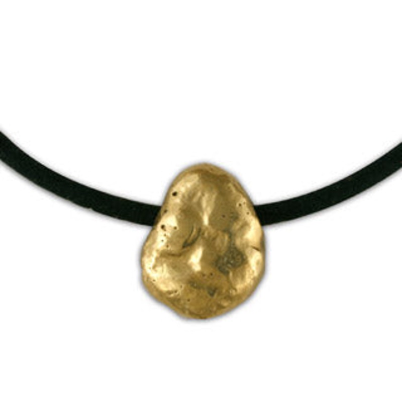 Here is a fair trade gold nugget, from the Sotrami mine in Peru. This gold represents an entire paradigm shift in the jewelry world. It is traceable to the mine and there is a premium that goes back to the community. The actual price of the nugget is determined by the spot market and the weight. Please call if you are interested to discuss price. Comes on Black Cord with a silver lobster claw closure. 18K Gold, Weight: 1/2 oz