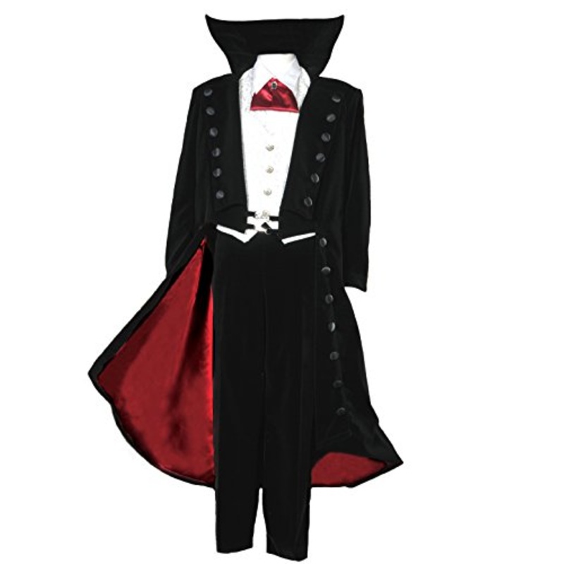 Includes: Deluxe Black Velvet Long Coat with Back Flare, Silver Brocade Vest, Matching Pants and Red Ascot Tie with center Jewel..Color: Black/Wine (shown)Size: M (38-40), L (42-44),XL (46-48), 2XL (52)Made in the U.S.A. /Superior Qualityand craftsmanship.