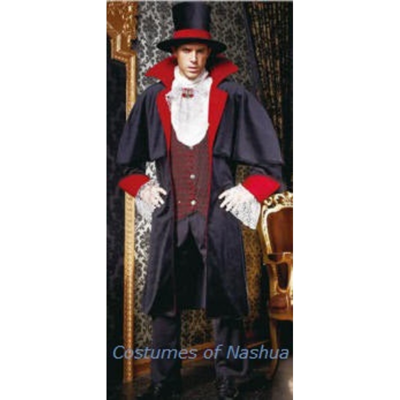 Very Nice QualityIncludes: Long black velour knee length coat/robe, attached elbow length shoulder cape accented w/red cuffs, red facings w/black braid trim, grey lace flounce at sleeve cuff, red w/black net overlay & sequins vest, attached lace jabot, att