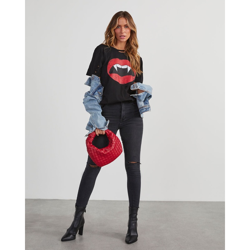 // Exclusive// Its spooky season in the Vampire Lips Distressed Cotton Tee. This classic fit black tee features a crew neckline, short sleeves and distressed fabrication. Finished with a red and white vampire lips graphic