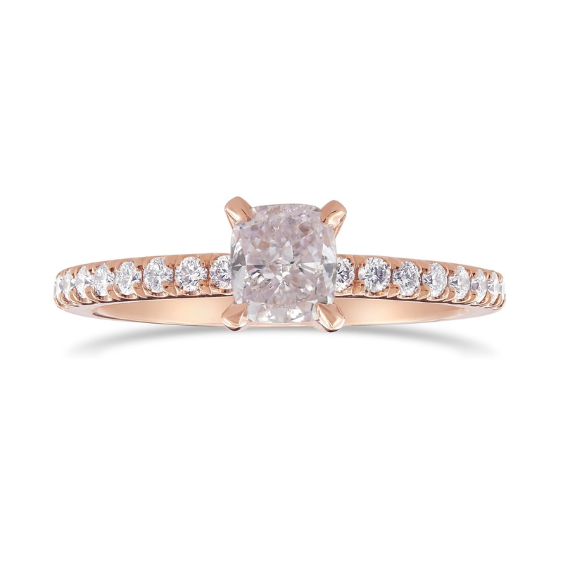 A beautiful Solitaire ring setting with a center Very Light Pink Cushion shape diamond, and with F+ color round brilliants set half-way along the shank, with open-pave setting. The ring is mounted with 14K Rose gold.