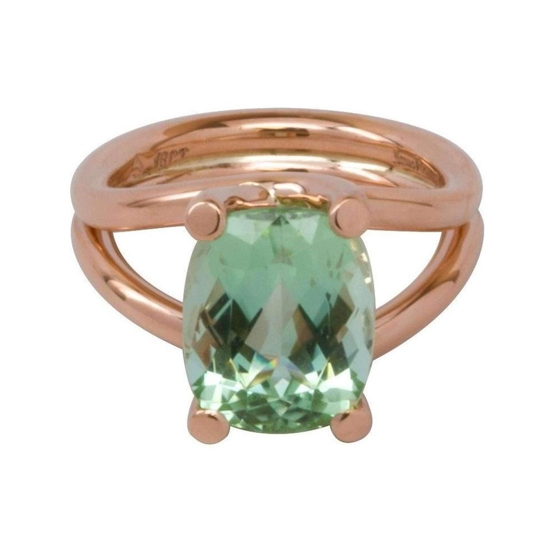 The Apple Green Tourmaline prong set in red goldfeatures a bold, contemporary design that makes it a true statement piece. The stunning red gold band showcases the sparkling cushion cut Tourmaline and it vibrant Apple Green colour.