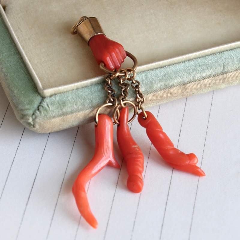 Carved coral is one of my favorite things, we're so happy to have found this mid-19th century Victorian talisman pendant featuring a skillfully carved coral hand holding three coral charms. The charms take their cue from the natural shape of the coral bran
