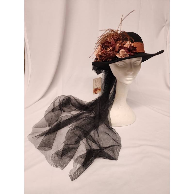 Black felt gambler hat w/antique brown satin ribbon around the crown, antique brown flowers,brown ostrich & black English netting bow &train down the back.