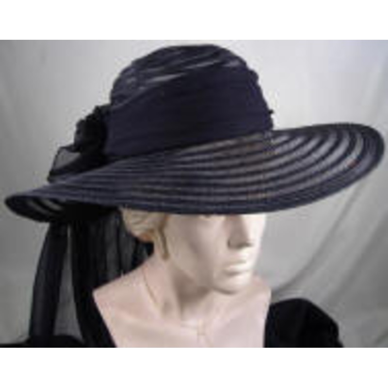 Black sheer straw mesh large brim with a black chiffon scarf tied around the crown, black chiffon bow and brown flower in the back.Hat Color: Black