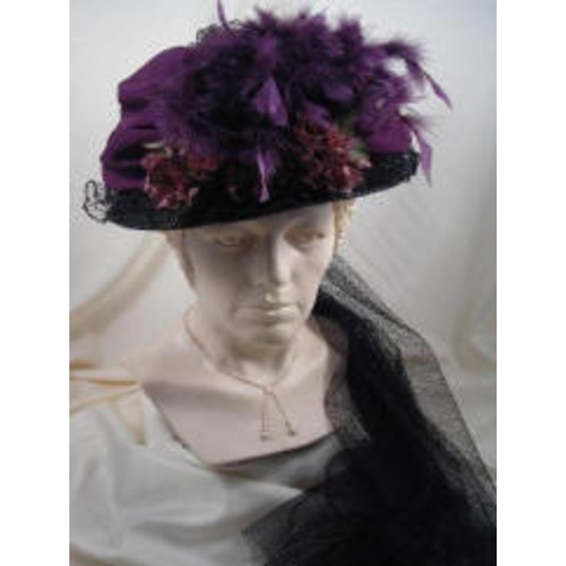 This style is one of our most popular.Black Walk in the Park hat with a eggplant pleated top, black ruffled lace on the brim, plum flowers and plum feathers. It is finished off with a black English netting bow and train on the back.