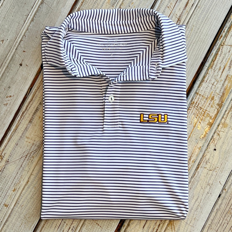 Mens Vineyard Vines LSU Polo.Classic, relaxed fit for everyday wearUPF 30+ sun protection for long days in the sunQuick-drying and moisture wickingBuilt-in stretch for comfort and movementWrinkle-resistant for a clean lookCollar stand3 button placketImport