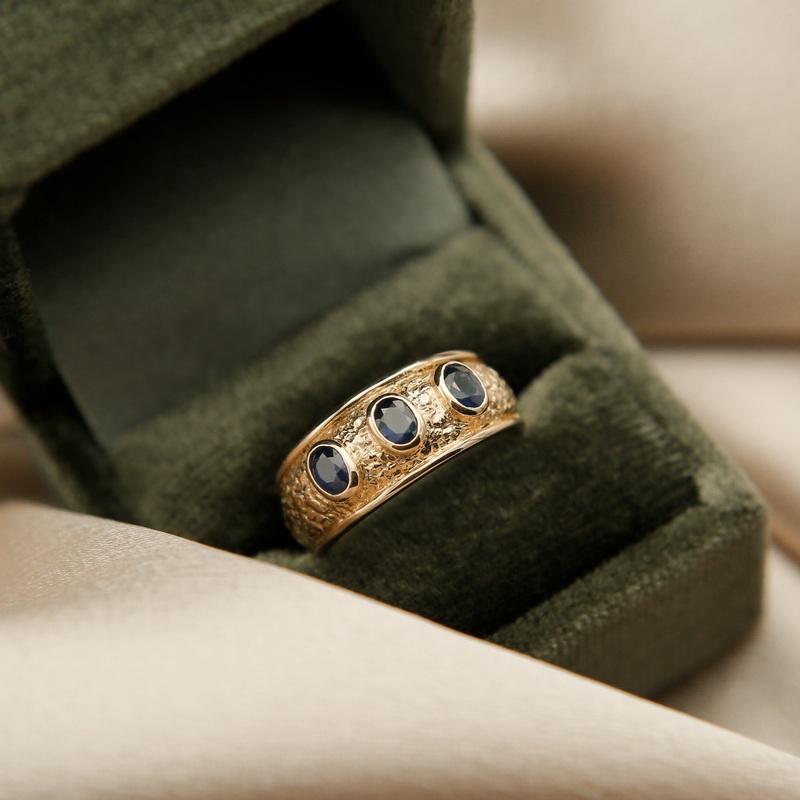 Stunning 19k yellow gold textured ring with three incredible natural sapphire set in the band. This ring is a hand carved cast design with slight dome.