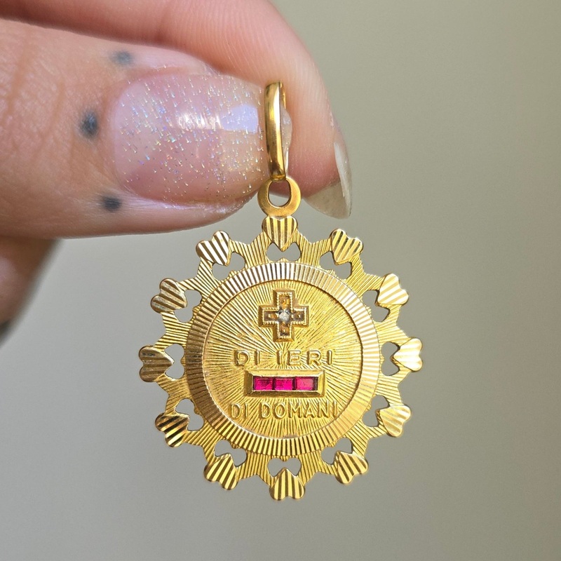 Details:Approximately 1 1/8″ in diameter. Set with a natural single-cut diamond in the plus sign, and synthetic rubies in the minus. Marked for 18k on the back, with Italian hallmarks indicating manufacture pre-1968 by manufacturing jewelers Unoaerre. Weighs approximately 6.5 grams.