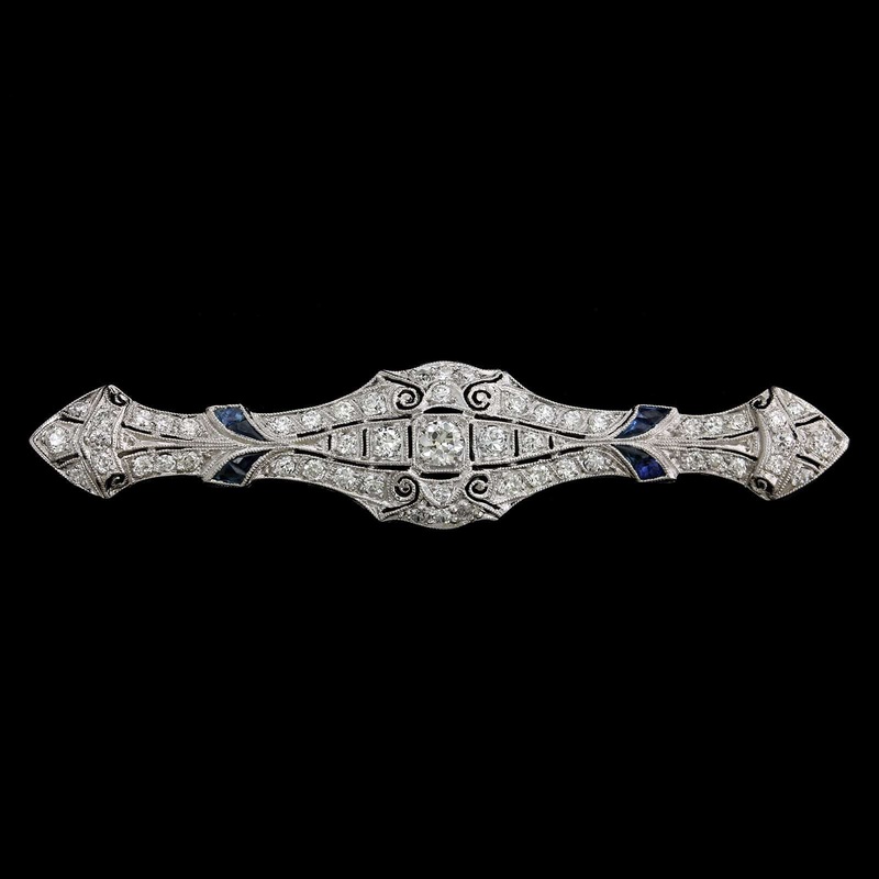 Vintage Platinum Estate Diamond and Sapphire PendantThe pendant is set with 51 old cut diamondsDiamonds are approx. total wt. 1.25cts., G-H/VS,And 8 fancy cut sapphires, length 2 1/8"