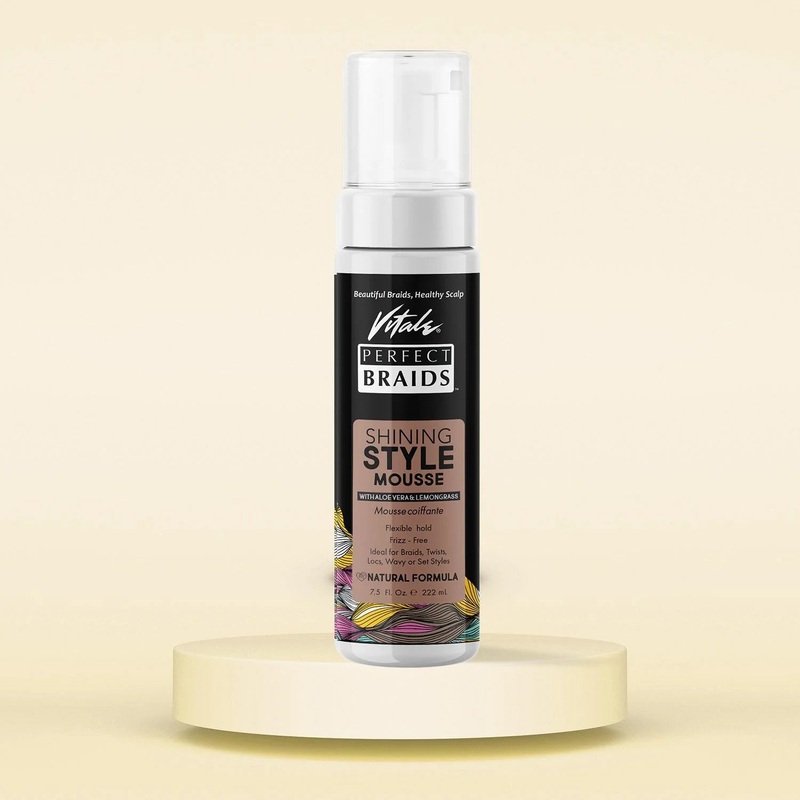 Vitale Perfect Braids Shining Style Mousse gives your braids, twists, locs, wavy and curly styles ultimate shine and flexibility with long-lasting frizz-free hold.Benefits of Mousse for Braids:Adds shineMoisturizesProvides lightweight, flexible hold