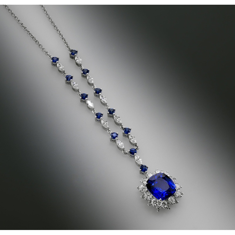 An extraordinary Sapphire & Diamond necklace, featuring a 3.80 carat cushion sapphire, certified by GRS as ‘Vivid Blue’ (heated). The necklace is adorned with 0.92 carat total weight round blue sapphires, and 1.57 carat total weight, collection colorless marquise and round brilliants. Mounted in 18K White gold.