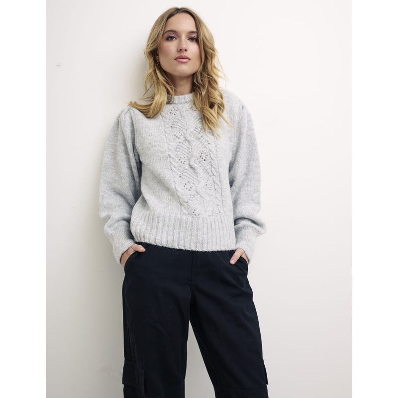 This blush pink jumper is all about the detail. Not only has it been lovingly crafted with classic cable stitching, pretty pointelle and puff sleeves, its also softer-than-soft. Style yours with cargo trousers or half-tucked into jeans.Crew neckRibbed edge