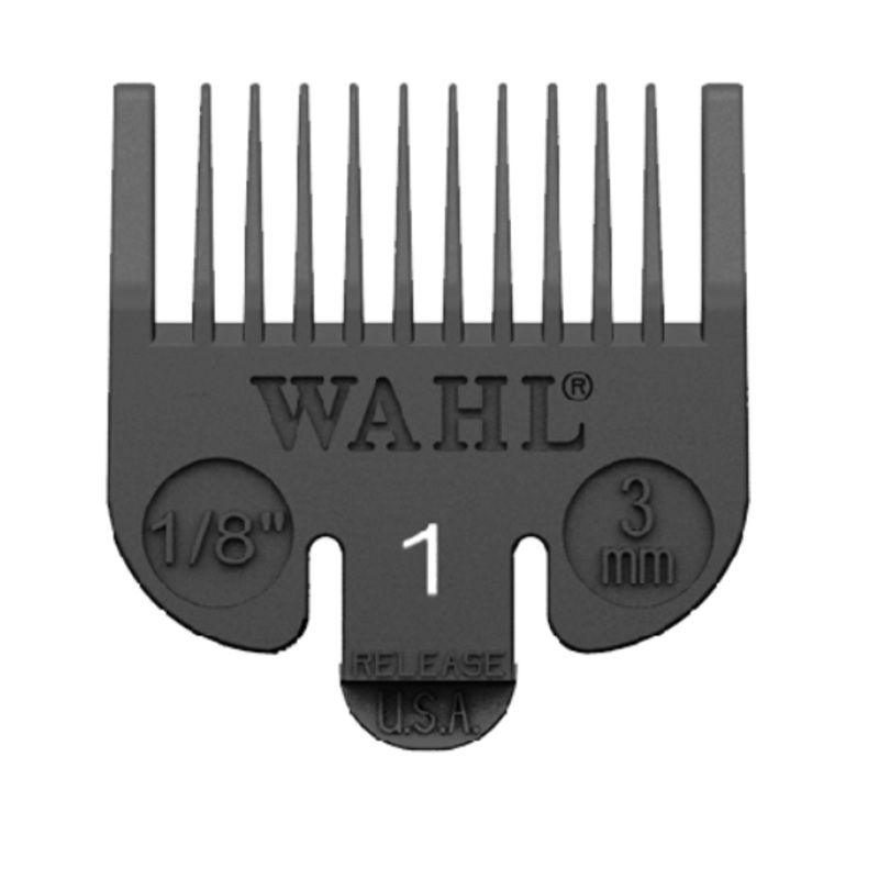 The WAHL ATTACHMENT #1/8 CLIPPER GUIDE features a standard plastic attachment comb that fits all Wahl full size clipper blades. With an indicated color of black, this guide offers an exact 3 mm cutting length for professional-style grooming. Color-coded gu