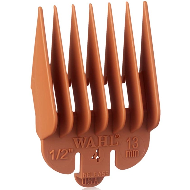 Professional grade plasticFits all size Wahl clippersEasy, snap-on mountingDurable nylon combOrange Color-Coded Clipper Guide #4Leaves Hair 1/2" (13.0 mm)Numbered Coded CombWon't Snag or Pull HairMaintain Precision Lengths