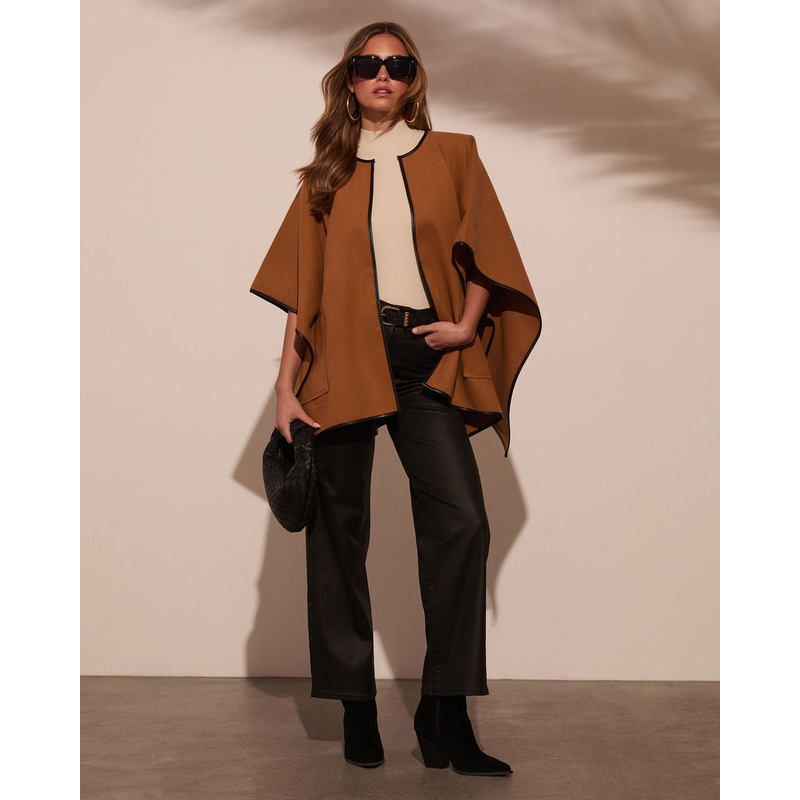 Stay warm and chic for the season so long as youre wearing the Warm Welcome Contrast Trim Poncho. This cozy layer features soft brushed fabric that feels oh-so-comfy, while the contrast leather trim adds a touch of sophistication. The front hook and eye cl