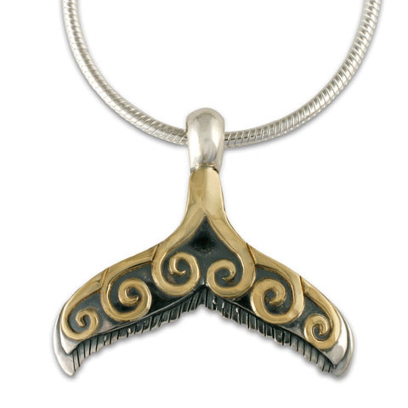 The Whale Tail Pendant is inspired by whales, magnificent creature who some believe to be the keeper of our ancient histories. Helen designed this Celtic whale tail to honor the world's greatest creatures. The gold Celtic motifs create a sense of waves and