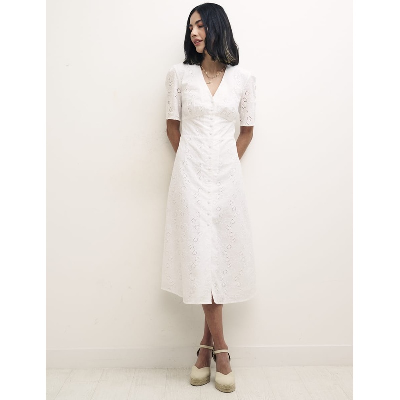 Our trophy style in white. Alexa is all about the vintage-inspired details, from the timeless tea dress cut to the delicate covered buttons. Weve also added a subtle shirred back to gently pull you in at the waist. Elevate her with espadrilles and a gold c