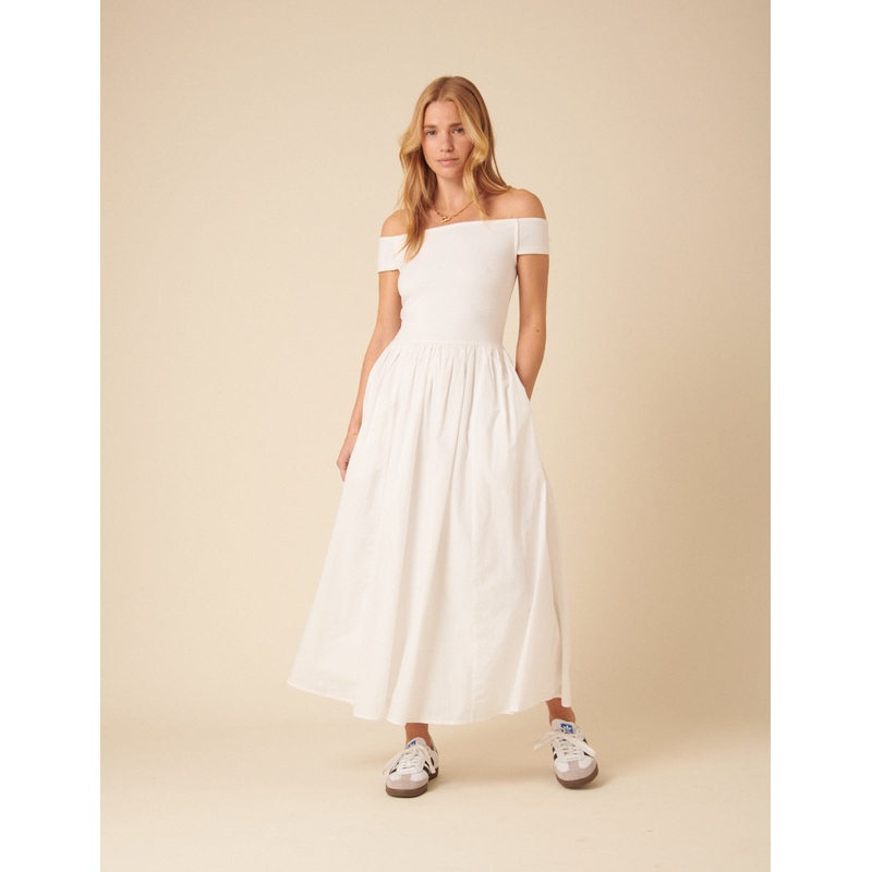 The dress you can always count on. Coming in white, our midi dress features a bardot neckline that sits off the shoulders and an easy jersey silhouette. Off-the-shoulder style Elasticated waist for comfort Side pockets Designed to be semi-fitted Size tip: