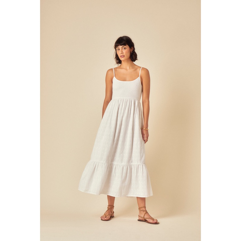 What pairs better with a sunny day than a breezy white dress? This shirred number is just what your wardrobes always wanted with floral embroidery and a tiered skirt.