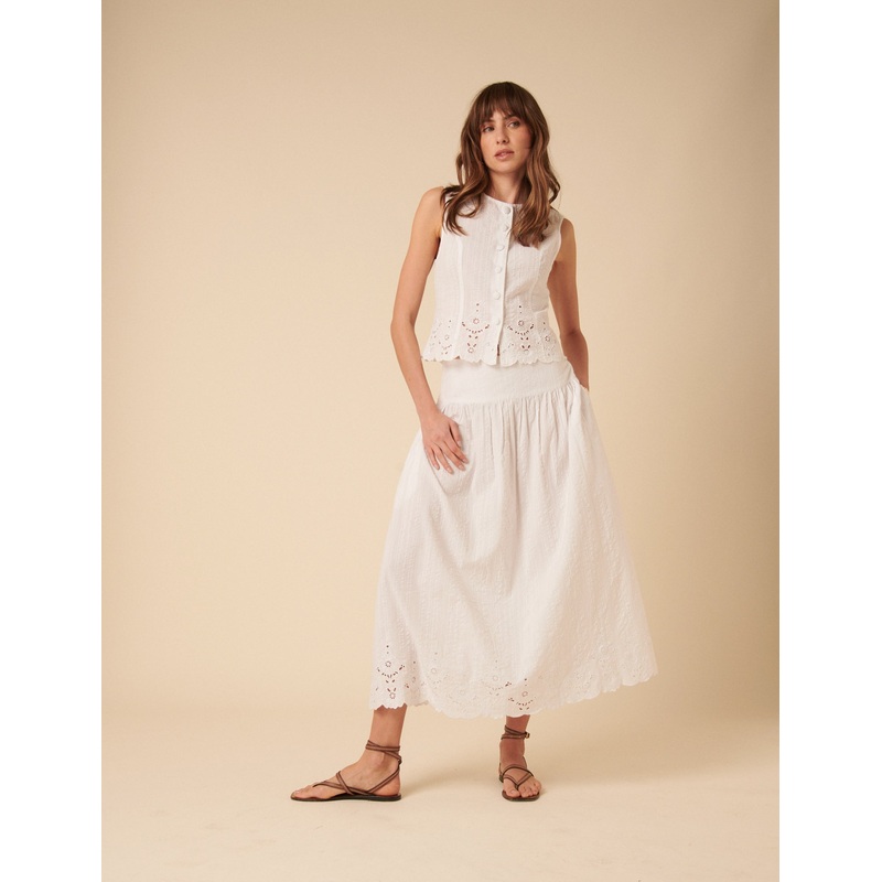 The white skirt youve been looking for. The relaxed fit is perfect for those long summer evenings. We especially love the embroidered detail and scallop hem. Wear with our matching Layla top.