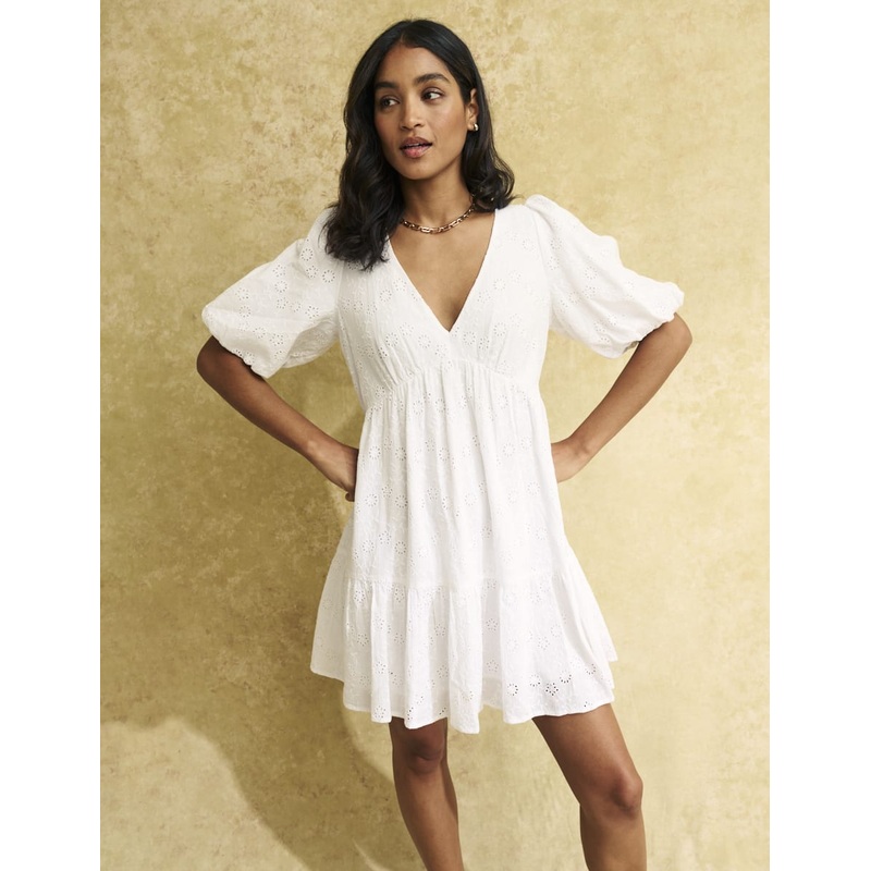 Detailed in white broderie anglaise, our Vienna smock dress calls for days spent in the sun, whether its at home or on foreign shores. The fit is relaxed and roomy. She then plunges to a low v-neck before flipping into a tiered skirt with tie detailing to