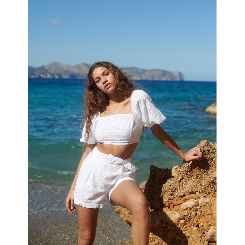 Destined to make them do a double take. This white broderie crop top is accented with embroidered florals. Puff sleeves have been offset by a square neckline. Layer up with gold necklaces and the matching high waisted shorts.Square neckShort puff sleevesCo