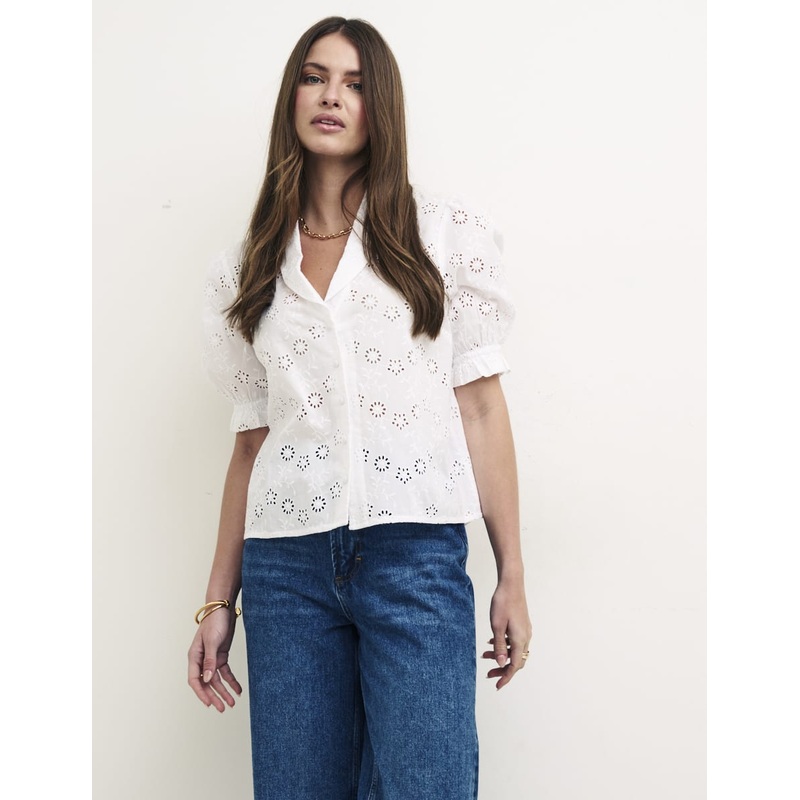 "Weve taken the classic white shirt and reimagined it for summer. Stitched with sunshine-ready broderie anglaise, Melissas ideal for warm days. Button her up and style simply with wide leg jeans. Small collar Short puff sleeves Covered buttons "