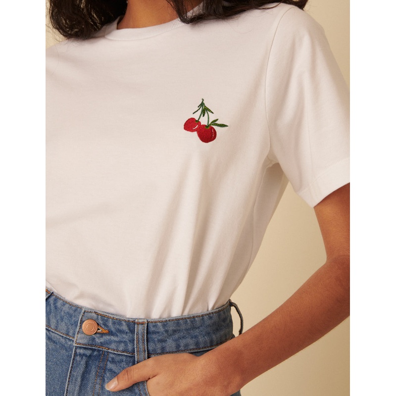 The cherry on top. Our classic white t-shirt is designed with a round neck and short sleeves. We love the embroidered red cherry and relaxed fit. Style yours with everything you already own. Crew neck Short sleeves Designed for a relaxed fit Size tip: we r