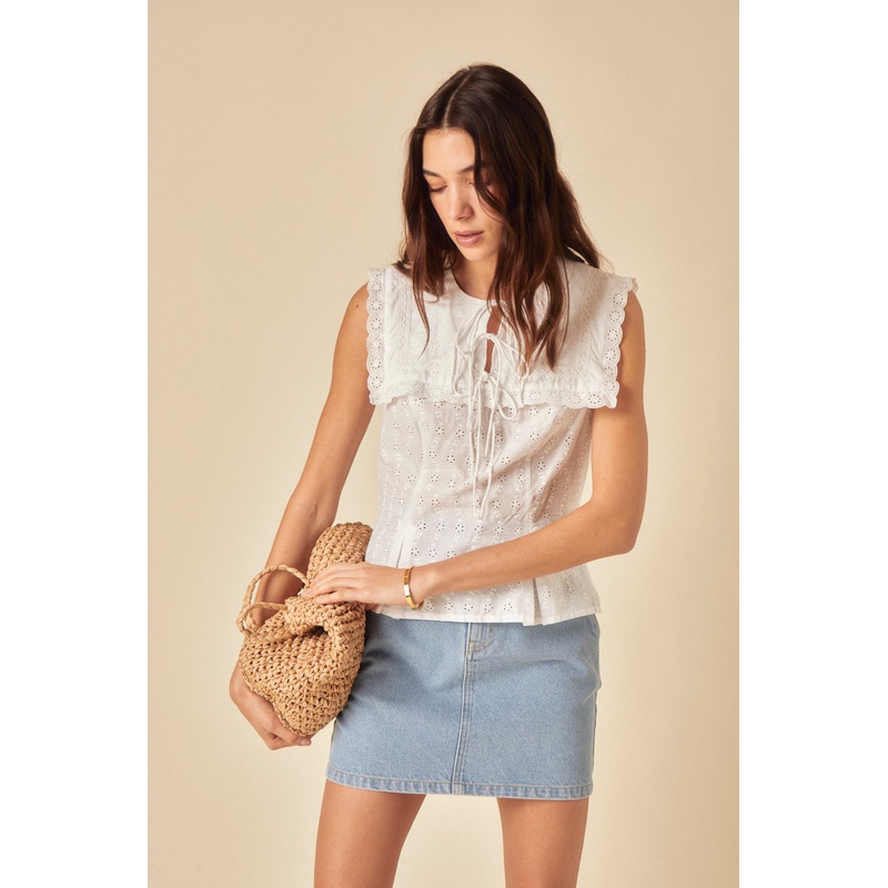 A touch of romance. With vintage-inspired embroidery and a tie neckline, youll wear this one on repeat. Looks good with denim or a floaty skirt. Collared Sleeveless Size tip: we recommend your usual size