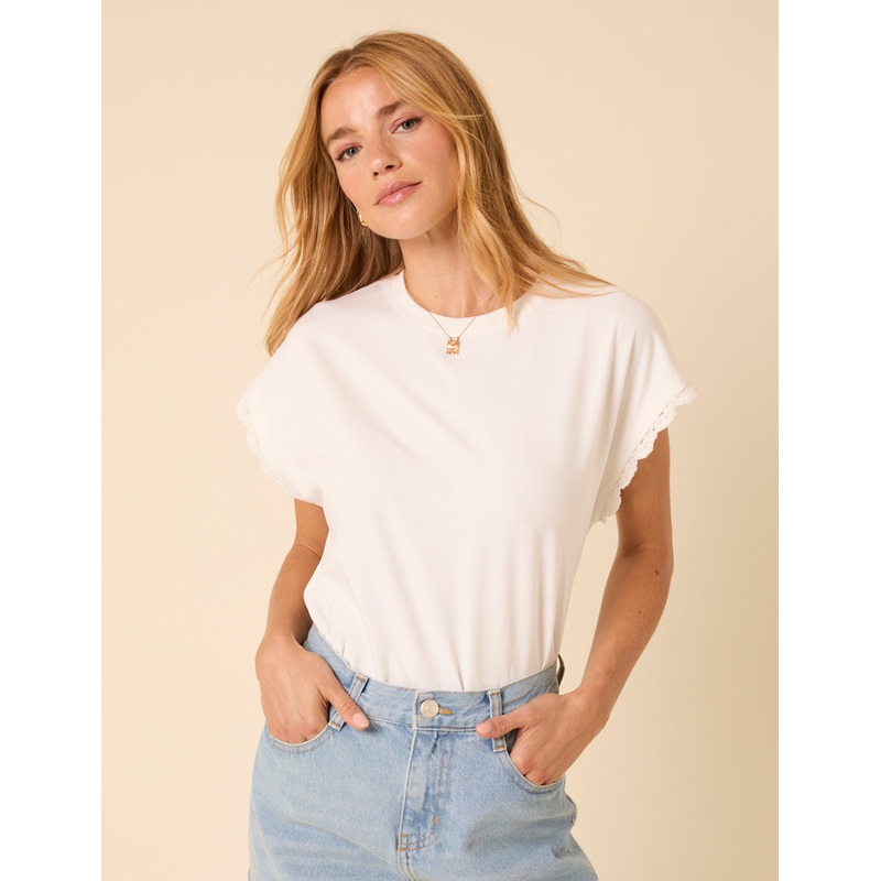 Not your average top. This white top has crochet trim detailing for a little extra something. Just add jeans.Round neckSize tip: we recommend your usual size