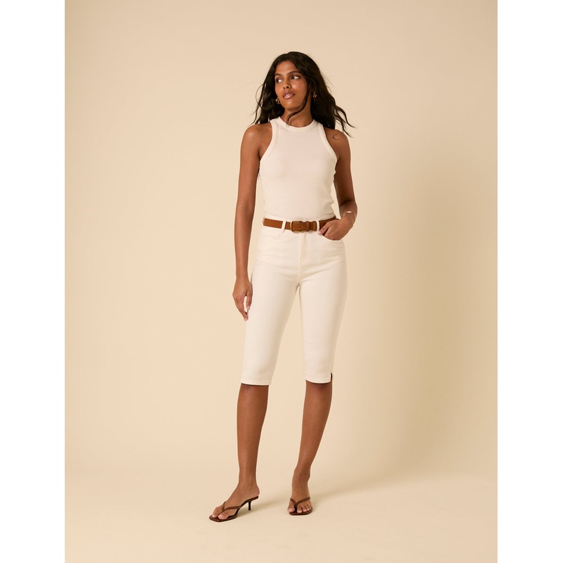 The throwback you didnt know you needed. These white denim capri pants hit mid-calf with a high waist, belt loops and slim fit. High waisted Belt loops Classic five pocket style Zip fastening with silver-tone NC button Size tip: we recommend your usual siz